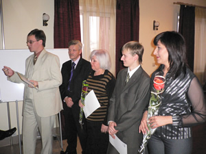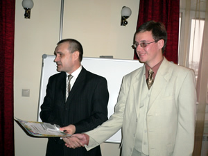 Леонидова Елена вручает памятный подарок Александру Скороходу